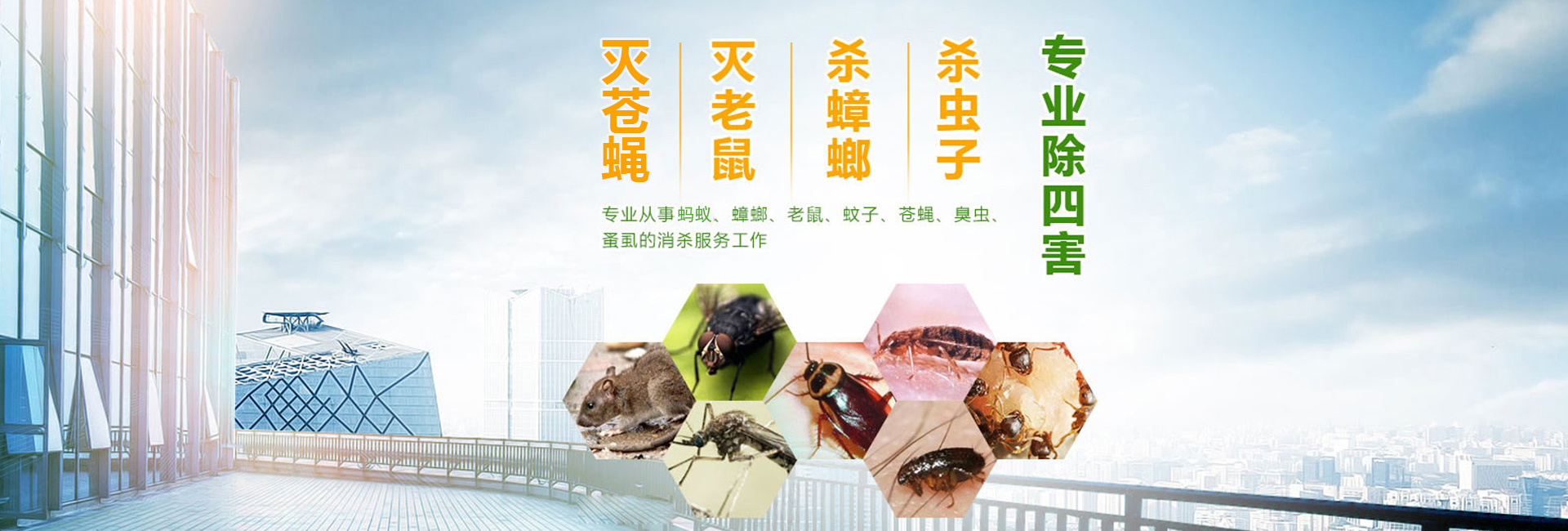 服務(wù)于為賓館飯店、餐飲業(yè)、食品加工業(yè)、建筑業(yè)、商場(chǎng)、超市、學(xué)校、工廠、醫(yī)院等單位和家庭提供鼠蟲害等有害生物防治。